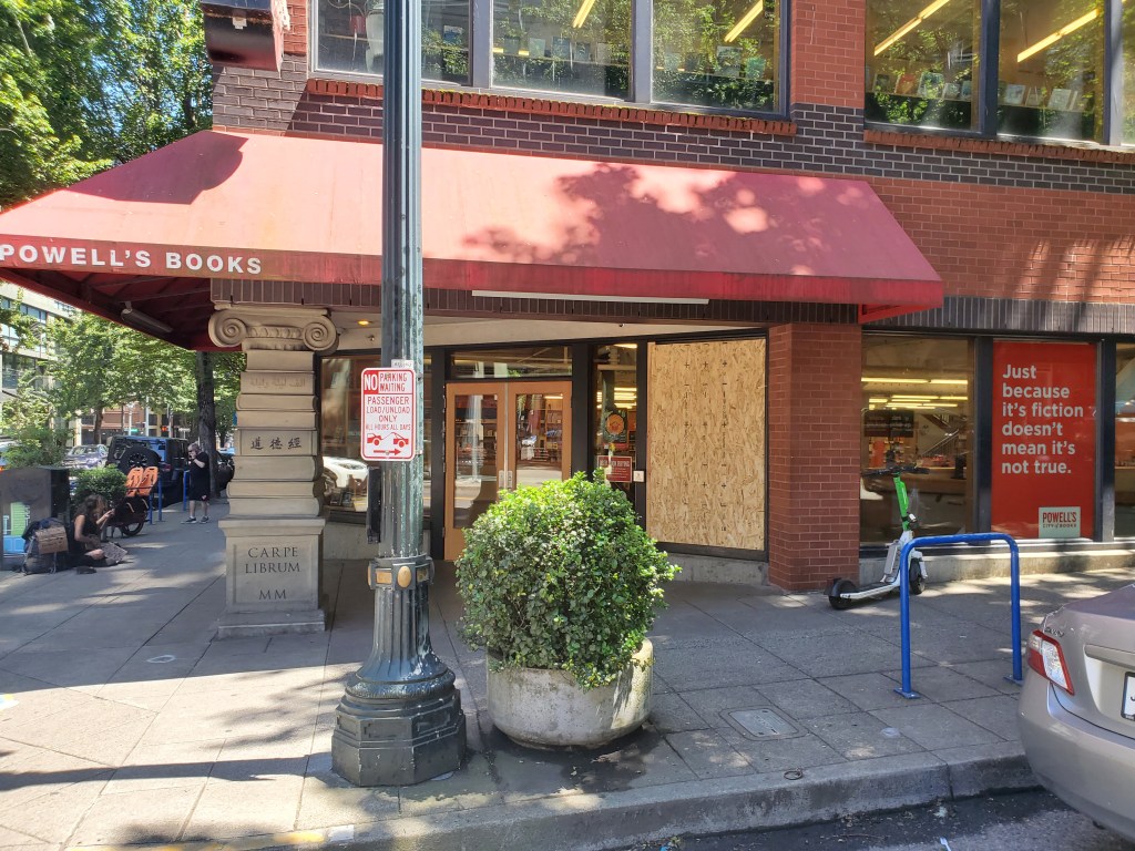 Speaking of libraries, one of Downtown Portland’s famous landmarks is Powell’s Books. Occupying an entire city block in order to house over one million publications, the business claims itself to be the world’s largest independent bookstore. The allure rests simply with the sheer size and selection, for Powell’s is known for being a no-frills retailer. There are worse problems to be had than getting lost in a bland maze of books though. In typical Portland fashion, one of the entrances featured a homeless busker and a broken window covered in wood.