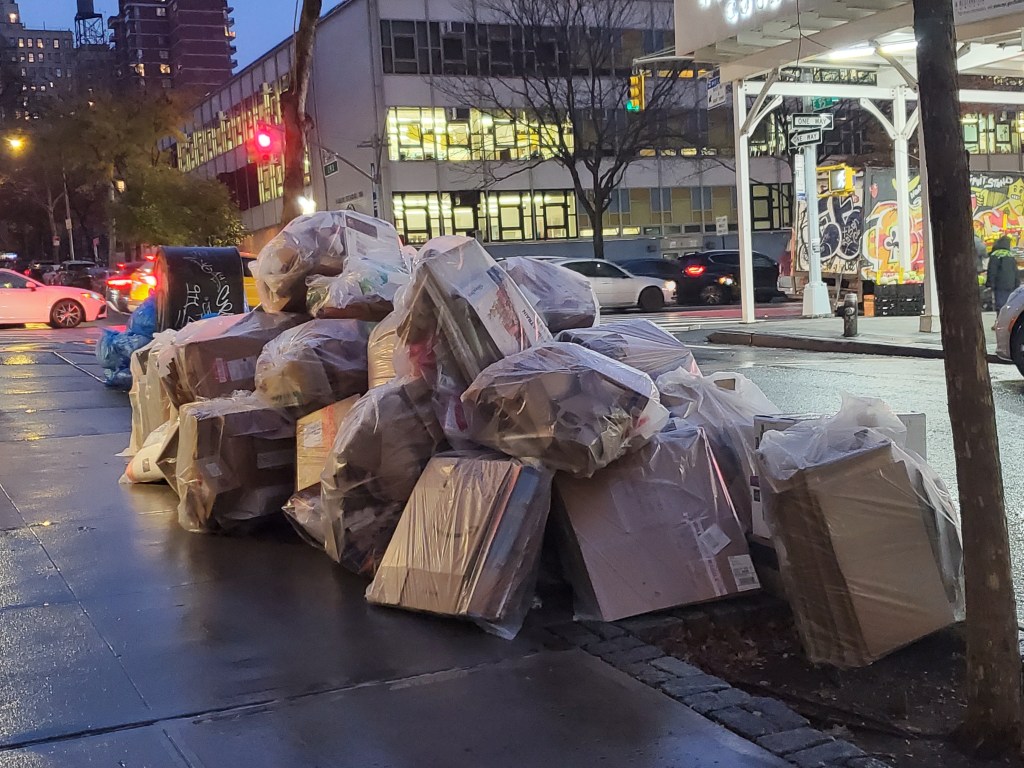 Of course, Amazon packages result in an excess of cardboard and plastic. All that refuse must go somewhere. Trash and recycling days in the city make going for a walk a less pleasant experience as the bags pile up on the sidewalk.